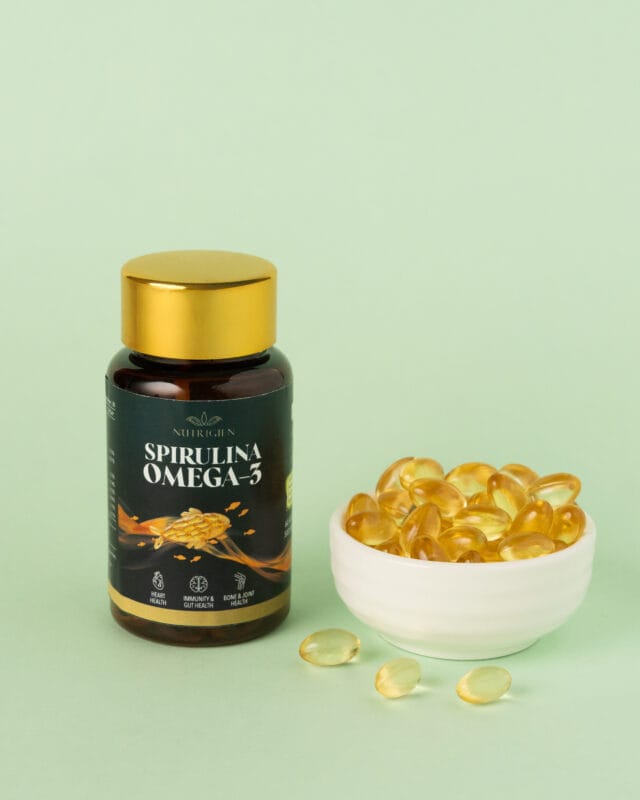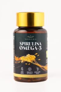 Spirulina is a nutrient-dense superfood rich in plant protein, chlorophyll, vitamins, minerals, and antioxidants, while Omega-3 fatty acids (EPA & DHA) are known for their role in heart, brain, joint, and eye health.