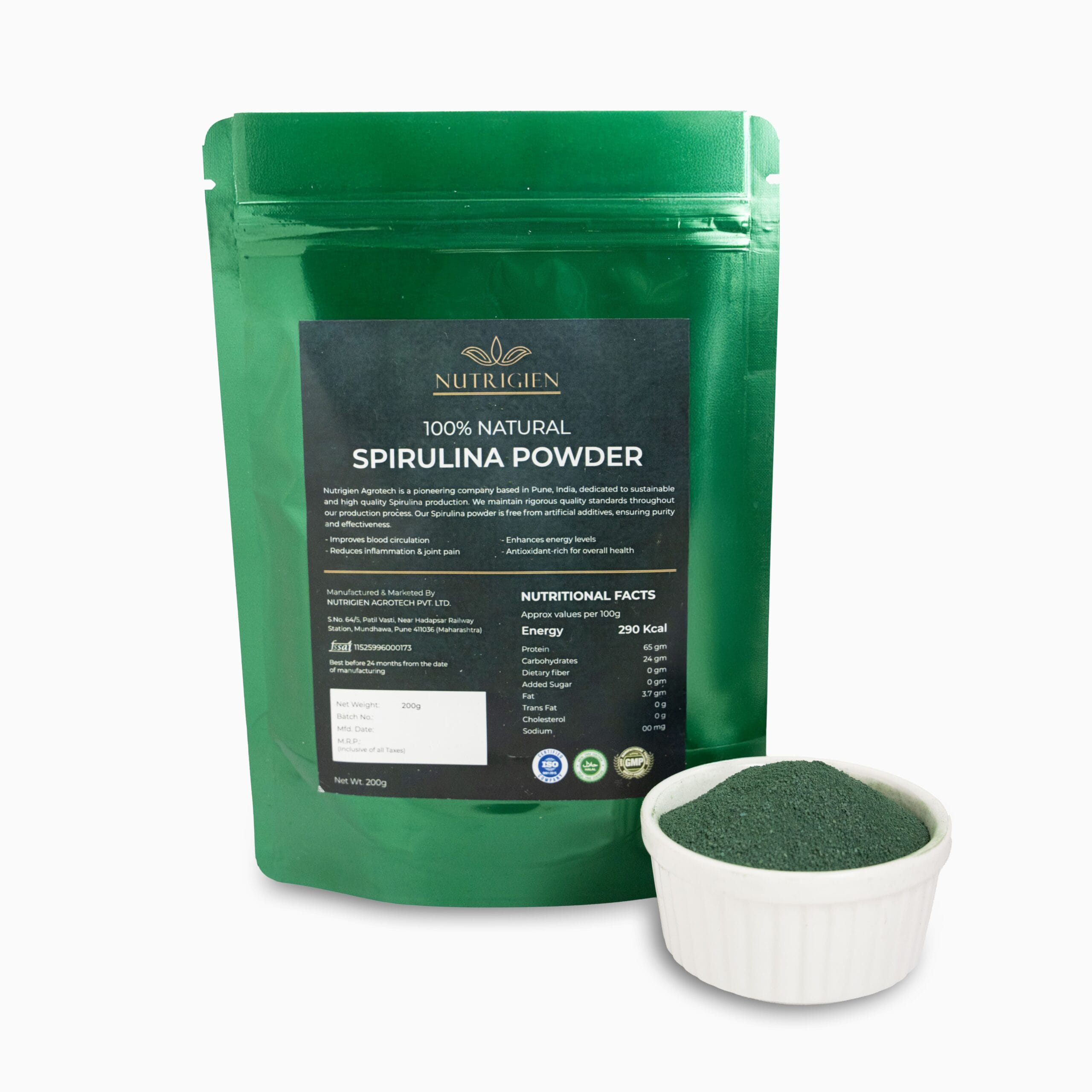 Nutrigien Spirulina Powder is made from high-quality, carefully cultivated Spirulina, known for its rich nutritional profile and plant-based protein content.