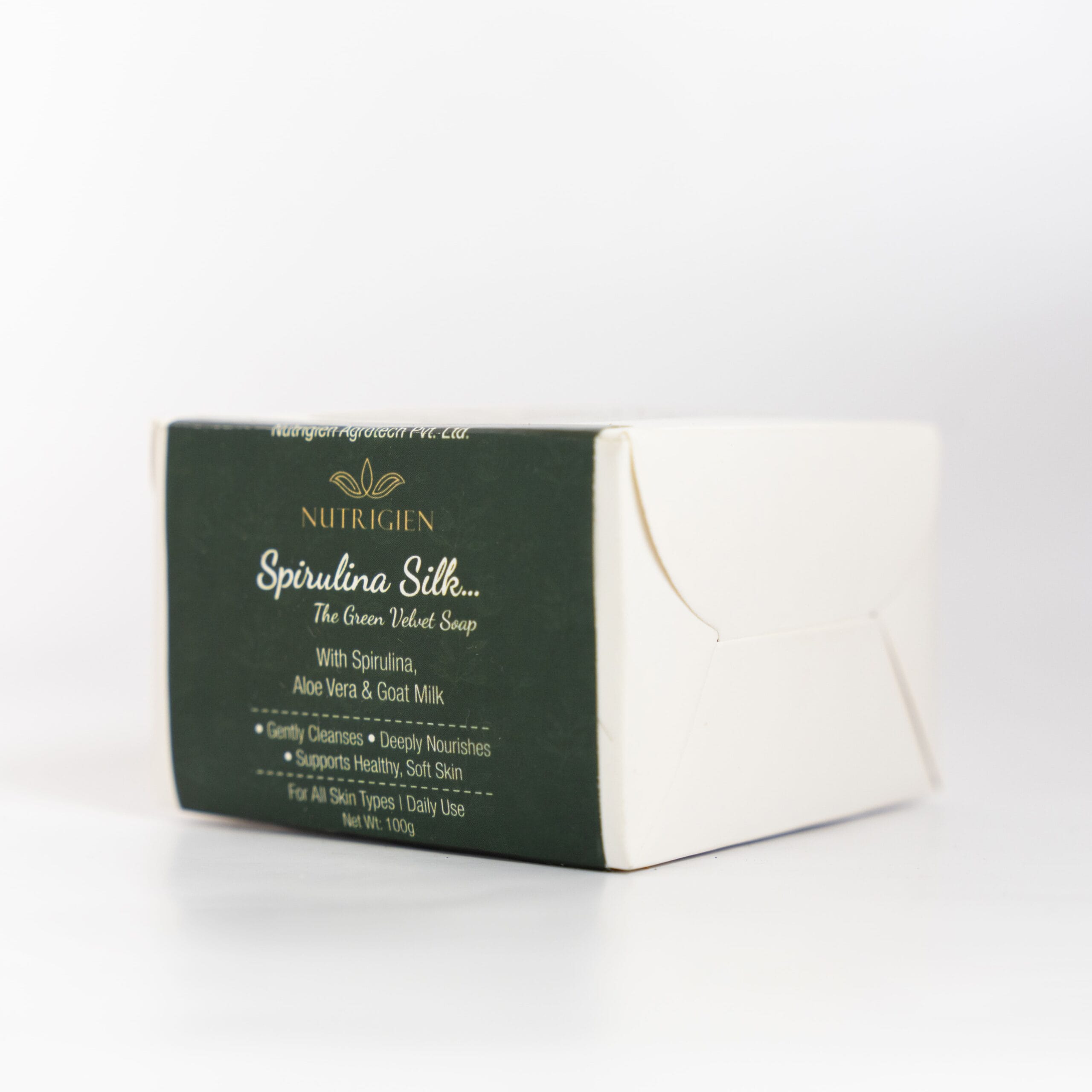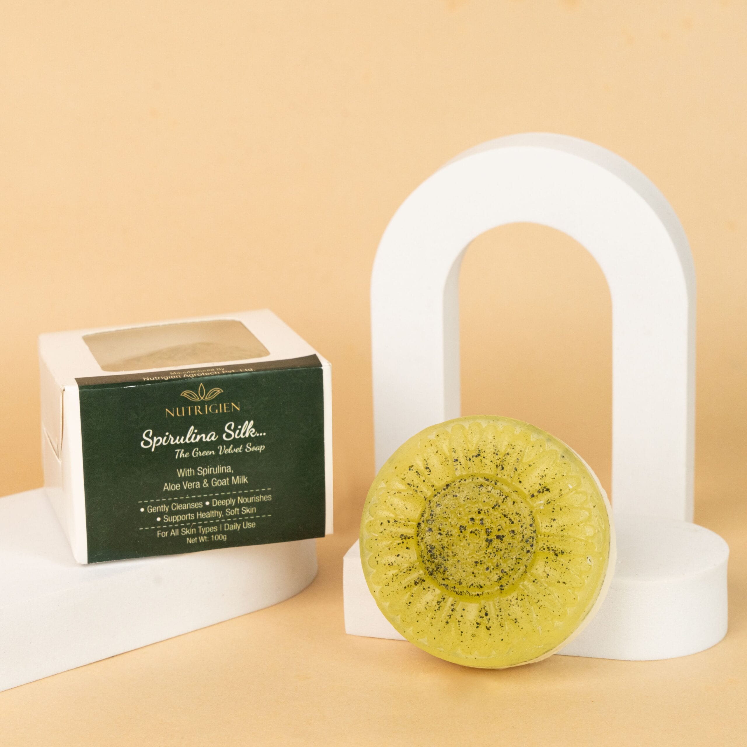 Spirulina Silk Soap is a luxury botanical bathing bar enriched with Spirulina extract, Aloe Vera, and Goat Milk. Designed to gently cleanse while supporting skin hydration, it leaves your skin feeling soft, smooth, and refreshed — without artificial colours.